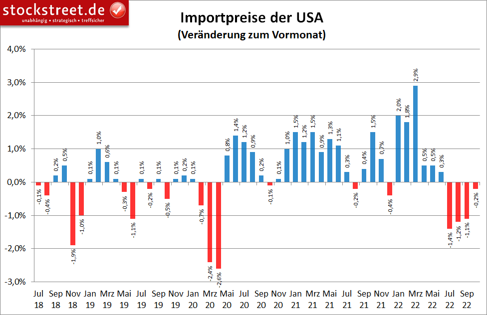 Im Oktober fielen die Preise für importierte Waren im Vergleich zum Vormonat um -0,2 %. Das ist zwar weniger als die erwarteten -0,4 % und deutlich weniger als die Rückgänge von jeweils mehr als -1 % in den drei Vormonaten, aber es war immerhin das vierte Minus in Folge.