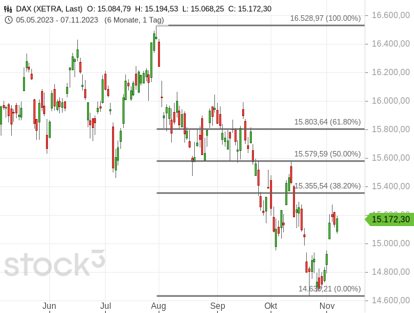 Dazu müsste der DAX allerdings weiter Stärke zeigen. Ein Rutsch auf rund 14.800 Punkte wäre das Gegenteil davon. Denn damit wäre ein Großteil der Kurserholung abgegeben und der DAX unter die Tageskerze gefallen, mit der sich der deutsche Leitindex aus der Bodenbildung im Bereich der Rechteckgrenze bei 14.720 Punkten herauskatapultieren konnte. Legen die Kurse aber nach dem aktuellen Rücksetzer wieder zu und überwinden sie das jüngste Hoch, ist gemäß der vorangegangenen DAX-Analyse vom 25. Oktober die Rechteckgrenze bei 15.430 Punkten das nächste Kursziel (siehe „Wen verwundert die aktuelle Schwäche des DAX?“). Wird diese erreicht, ist damit auch die obere Linie des Abwärtstrendkanals gebrochen. Und dann bestätigt sich dessen Charakter als trendbestätigende Konsolidierung, die im übergeordneten Kontext bullish zu werten ist.
