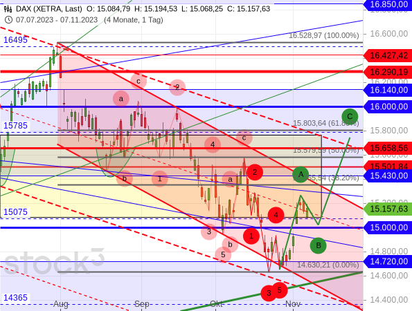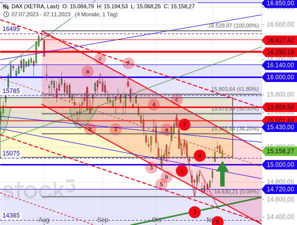 Immerhin konnte der DAX aber ein neues Korrekturtief vermeiden, welches aus Sicht der Elliott-Wellen im Rahmen einer Welle 5 noch möglich war (siehe folgender Chart). Stattdessen hat er den Abwärtstrendkanal (rot) auch bei einem erneuten Anlauf verteidigt und anschließend die Mittellinie bei 15.075 Punkten zurückerobert. Bei einem Rücksetzer wurde diese Chartmarke von oben getestet und als Unterstützung genutzt (siehe grüner Pfeil).