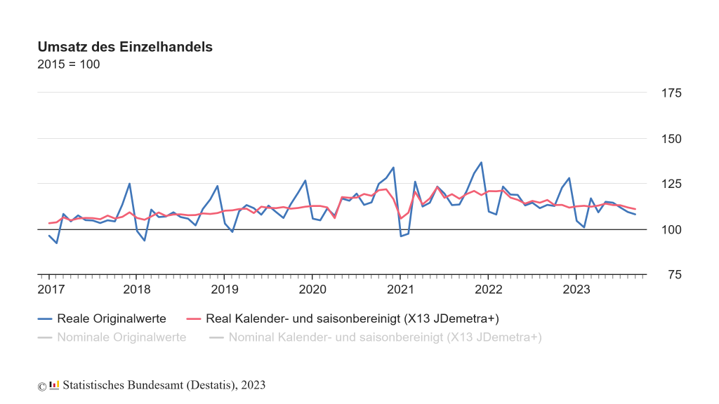 Zumal seitdem auch gemeldet wurde, dass die Einzelhandelsunternehmen in Deutschland im September real (preisbereinigt) -0,8 % und nominal -0,7 % weniger umgesetzt als im Vormonat. Passend dazu räumte das Statistische Bundesamt zu den BIP-Daten immerhin ein, dass besonders die privaten Konsumausgaben abnahmen.