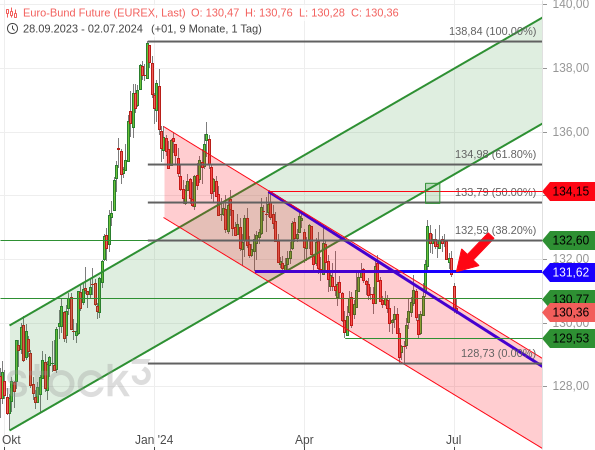 Der aktuelle Anstieg der Renditen am Anleihemarkt ist also politisch getrieben, vor allem durch die jüngsten Ereignisse in den USA (TV-Duell, Entscheidung des Obersten Gerichts), aber auch durch das Wahlergebnis in Frankreich. Doch derartige politische Börsen haben meist kurze Beine. Und da die EZB sehr deutlich auf eine zweite Leitzinssenkung zusteuert, auch wenn diese noch bis zur Sitzung im September oder gar Dezember auf sich warten lassen wird, sollten die Renditen hierzulande eigentlich nicht mehr auf neue Hochs klettern, sondern tendenziell sogar sinken.