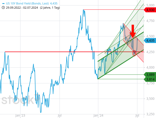 Als Grund dafür gilt vielmehr, dass die Chancen für einen Sieg von Donald Trump bei den anstehenden Präsidentschaftswahlen nach dem TV-Duell mit Joe Biden gestiegen sind. Zumal ihm jüngst vom Obersten Gerichtshof eine teilweise Immunität vor Strafverfolgung zugebilligt wurde. Und Marktteilnehmer rechnen damit, dass es unter einem US-Präsidenten Trump zu neuen Zöllen und Handelskonflikten sowie einer weiter steigenden Staatsverschuldung kommen wird. Und das lässt die Renditen steigen.