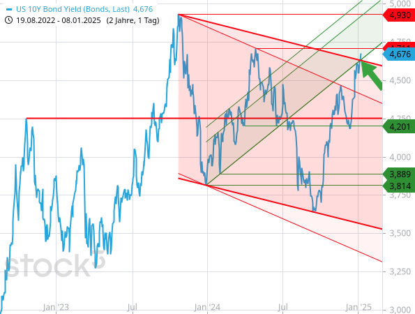 Die Zinssenkungserwartungen wurden nach unten korrigiert, die Renditen am Anleihemarkt stiegen entsprechend weiter an. Die vom Markt vielbeachtete 10-jährige US-Staatsanleihe erreichten mit einem Kupon von aktuell 4,676 % (im Hoch sogar mehr als 4,7 %) beinahe das Hoch vom April 2024. Auf dem Weg dorthin ist die Rendite auch aus dem alternativen Abwärtstrendkanal (rot im folgenden Chart) nach oben ausgebrochen und in den alten Aufwärtstrendkanal (grün) zurückgekehrt (siehe grüner Pfeil).