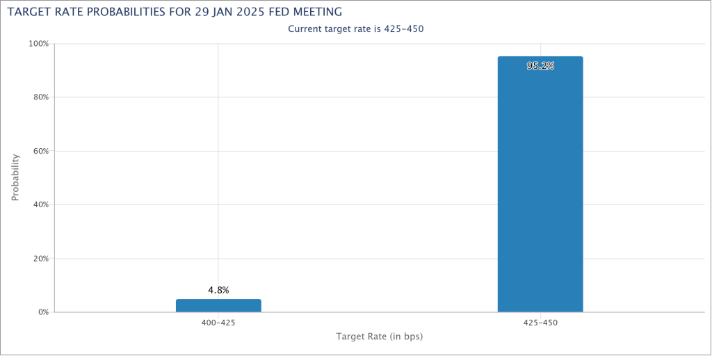 Kein Wunder, dass von den Märkten inzwischen nur noch eine Zinssenkung der Fed um 25 Basispunkte in diesem Jahr vollständig eingepreist ist. Diese wird aber sehr wahrscheinlich nicht auf der anstehenden Notenbank-Sitzung am 29. Januar erfolgen. Der Markt rechnet aktuell nur zu 4,8 % mit einem Zinsschritt, nachdem es am 19. Dezember mit 8,6 % immerhin noch fast doppelt so viel war.