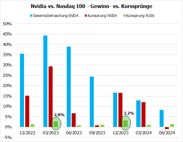 Nvidia hat die Gewinnschätzungen der Analysten stets deutlich übertroffen, prozentual zweistellig höhere Gewinne als erwartet waren üblich; mehrfach fielen die Gewinne sogar mehr als 30 % höher aus (blaue Säulen). Entsprechend stark stieg in der Regel der Aktienkurs am Tag nach der Gewinnbekanntgabe (rote Säulen).