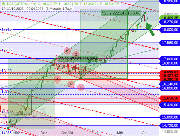 Und so kann der deutsche Leitindex weiterhin daran arbeiten, die Länge der aktuellen Aufwärtswelle auf das Ausmaß der vorangegangenen zu bringen und somit das Ziel der Wellengleichheit zu erreichen, auch wenn ihm dies nicht mehr im selben Zeitraum gelingen kann (grüne Rechtecke). Die Mittellinie bei 18.625 Punkten bleibt dabei das aktuelle Kursziel der Bullen.
