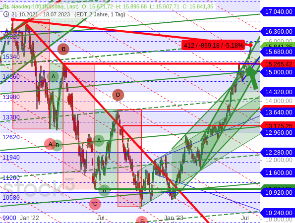 Im Börsenbrief „Target-Trend-Spezial“, in dem der Nasdaq 100 regelmäßig charttechnisch analysiert wird, war dazu bereits gestern früh folgender Chart zu sehen: