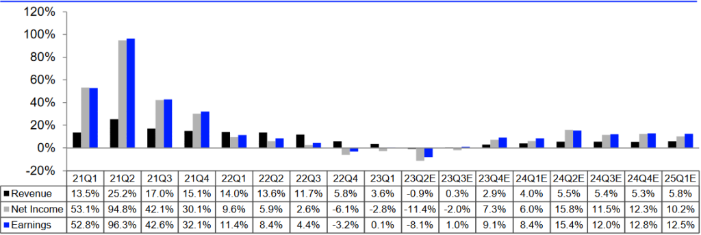 Es fällt auf, dass die Erwartungen bis einschließlich zum 1. Quartal 2024 reduziert wurden. Die Erwartungen für die folgenden drei Quartale wurden allerdings leicht angehoben. Und insgesamt sind die Wachstumsraten ab dem 4. Quartal 2023 recht ansehnlich. Zu dieser Einschätzung kommt auch die Berenberg Bank mit folgender Grafik: