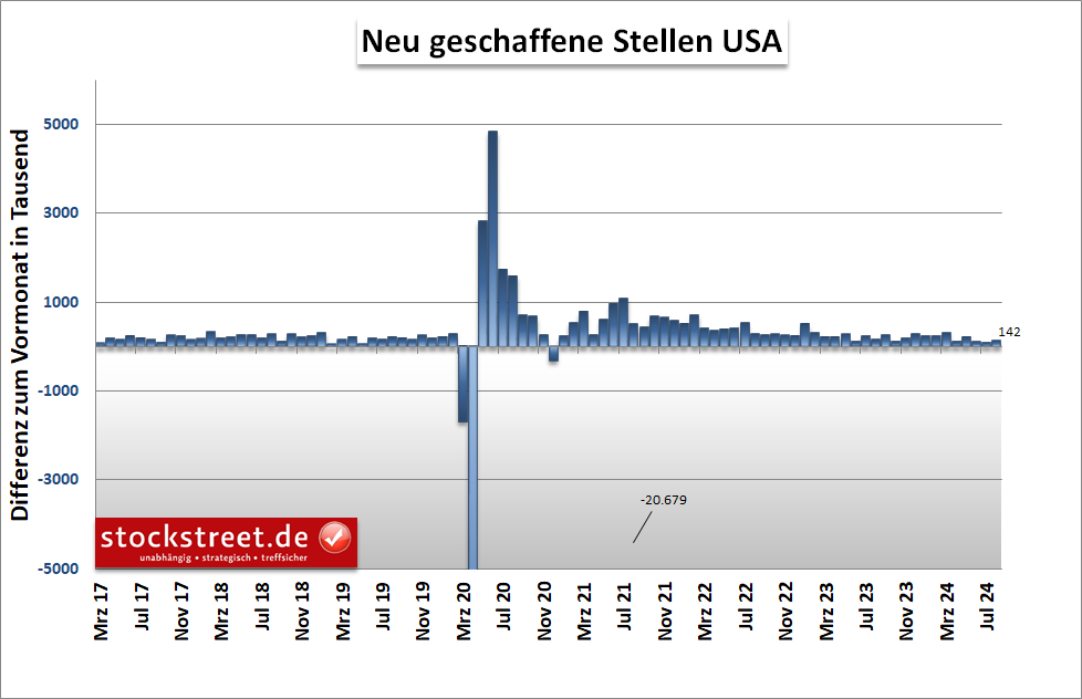Ein etwas schwächer als erwartet ausgefallener Stellenaufbau in den USA hat die Zinserwartungen der Anleger bestätigt. Laut dem monatlichen US-Arbeitsmarktbericht wurden im August 142.000 neue Stellen (außerhalb der Landwirtschaft) geschaffen. Experten hatten im Durchschnitt mit 164.000 gerechnet, nach abwärts revidiert 89.000 (ursprünglich 114.000) im Vormonat. Zudem wurde der Juni-Wert um 61.000 Stellen nach unten korrigiert.