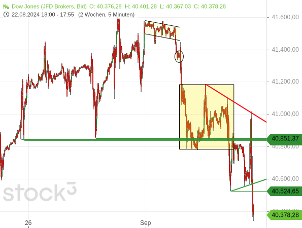 Ein Ende der Korrektur wäre zum aktuellen Zeitpunkt auch denkbar, weil der Dow Jones mit dem gestrigen Tief exakt das 38,20%-Fibonacci-Retracement der vorherigen Aufwärtsbewegung bei 40.406,38 Punkten als potentielle Unterstützung erreicht hat.