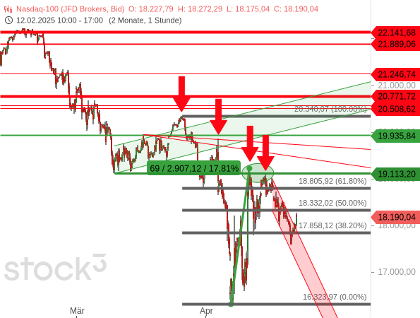 Jedoch liegt immer noch eine klare Folge tieferer Hochs vor (rote Pfeile). Und daher ist die Abwärtstendenz des Nasdaq 100 noch intakt und die Korrektur somit noch nicht beendet. Statt „buy the dips“ gilt derzeit scheinbar „sell the rallys“. Damit sich dieses charttechnische Bild ändert, braucht es ein Ende der tieferen Hochs – also aus aktueller Sicht einen erneuten Anstieg über die Marke von 19.113,2 Punkten.