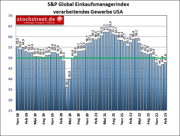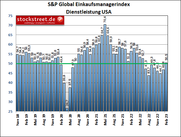 Nicht nur in Deutschland und der Eurozone hellt sich die Stimmung auf (siehe vorgestrige Börse-Intern). Auch in den USA nimmt der Optimismus zu – sogar überraschend deutlich. Der Einkaufsmanagerindex von S&P Global für die gesamte Wirtschaft – also Industrie und Dienstleistung zusammen – sprang mit 50,2 Punkten im Februar über die Schwelle von 50, ab der Wachstum signalisiert wird. Ausgehend von den nur 46,8 Zählern des Vormonats war das ein sehr kräftiger Stimmungsumschwung. Zumal nur ein Anstieg auf 47,5 erwartet worden war.