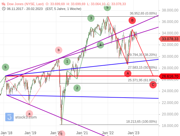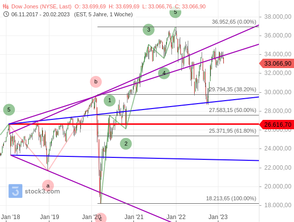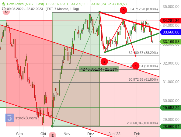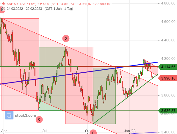 Vor ziemlich genau einem Jahr, am 24. Februar 2022, hatte ich diesen Chart übrigens zuletzt analysiert. Damals war der Dow Jones von oben an die Linie herangelaufen, deren Rückeroberung inzwischen zum vierten Mal gescheitert ist, seit die Kurse darunter geraten sind.