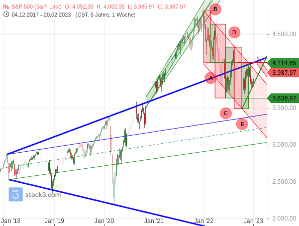 Interessant ist in diesem Zusammenhang ein Blick auf den (folgenden) längerfristigen Chart des S&P 500. Denn hier fällt auf, dass die Kurse jüngst nicht nur bei einem Versuch gescheitert sind, wichtige Hochs aus der zweiten Hälfte des vergangenen Jahres zu überwinden, sondern sie prallten auch ein zweites Mal an der oberen Linie einer alten Trompetenformation ab (dick blau).