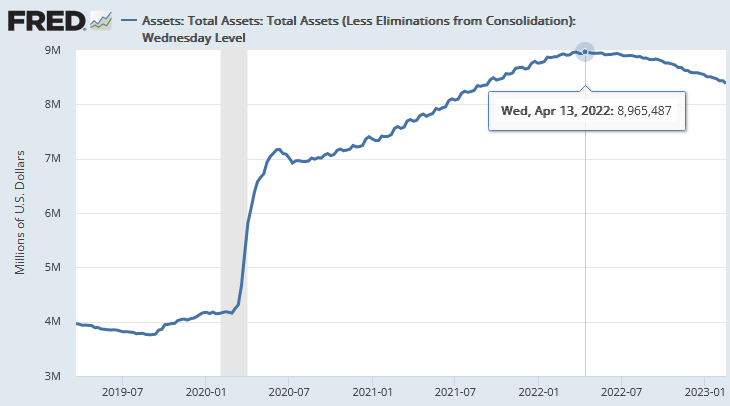Anfang 2022 erreichten die Aktienmärkte ihre Hochs und schwenkten in den Bärenmarkt ein. Wenig später erreichte auch die Bilanz der US-Notenbank ihr Maximum und wird seitdem kontinuierlich abgebaut – mit derzeit fast 100 Milliarden US-Dollar monatlich.
