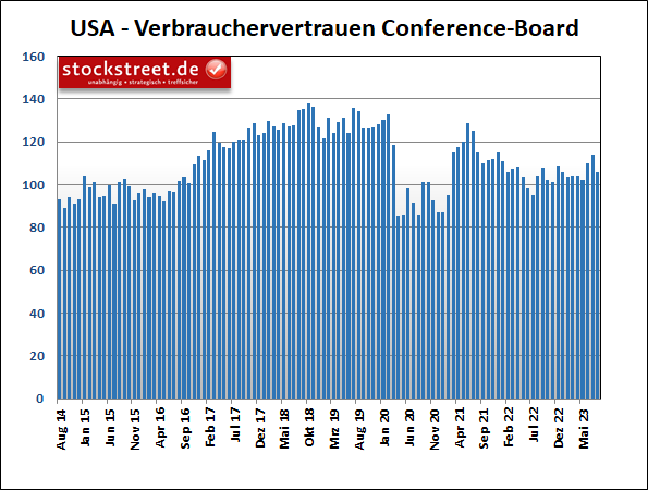 Zumal vorgestern auch noch der Index für das Verbrauchervertrauen des Conference Boards niedriger ausfiel als erwartet. Statt eines Anstiegs von 114 auf 116 Punkte, kam es zu einem deutlichen Rückgang auf 106,1 Zähler.