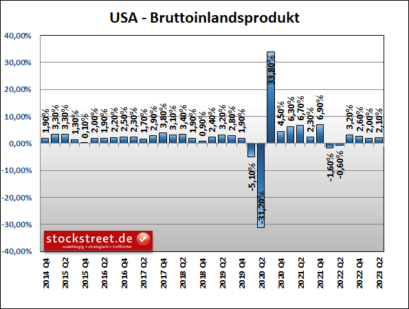 Außerdem ist die US-Wirtschaft im vergangenen 2. Quartal 2023 weniger stark gewachsen als zunächst gemeldet. Das Bruttoinlandsprodukt (BIP) legte im April, Mai und Juni „nur“ um (annualisiert) +2,1 % zu, statt um +2,4 %, wie das US-Handelsministerium gestern berichtet.