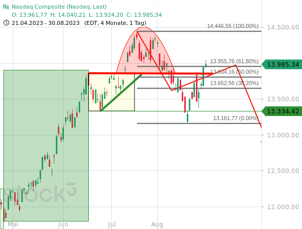 Die vorgestrigen Daten wurden dafür von den Anlegern umso positiver bewertet. Insbesondere die zinssensitiven Technologieaktien profitierten von der Spekulation auf ein Ende der Leitzinsanhebungen. Dadurch hat der Nasdaq Composite inzwischen sogar schon mehr als 61,80 % seiner vorherigen Korrektur aufgeholt (siehe graue Fibonacci-Marken im folgenden Chart).