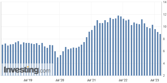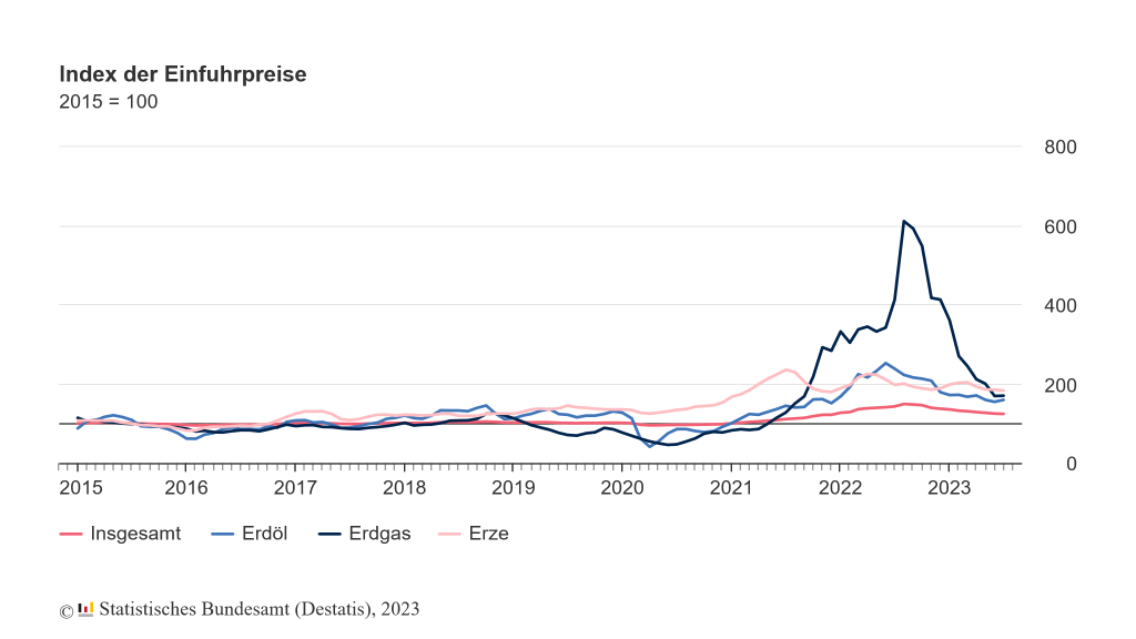 Energieeinfuhren waren im Juli 2023 um 47,4 % billiger als im Juli 2022, allerdings 1,4 % teurer als im Juni 2023. Ohne Berücksichtigung der Energiepreise waren die Importpreise im Juli „nur“ um 3,1 % niedriger als im Vorjahr. Und bei Investitions- und Konsumgütern stiegen die Preise weiter an – um 2,9 % bzw. 1,2 % zum Vorjahr.