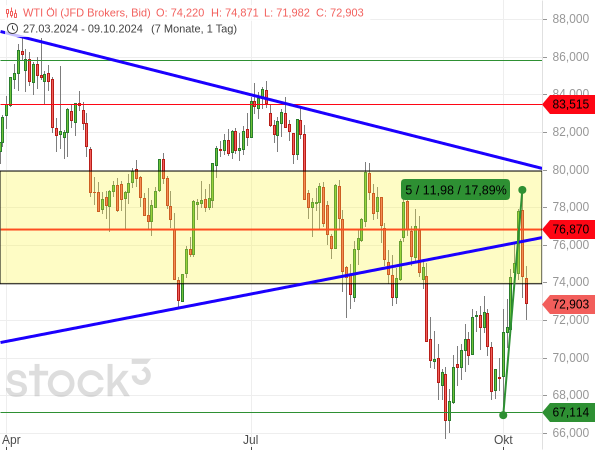 Das Inflationsproblem scheint dadurch noch längst nicht gelöst. Hinzu kommen die jüngst stark gestiegenen Ölpreise. Vom Tief des 1. Oktober bis zum vorgestrigen Hoch legte die US-Sorte West Texas Intermadiate (WTI) um fast 18 % zu.