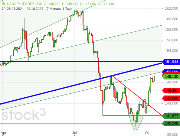 Ähnlich wie beim Anleihemarkt (siehe vorgestrige Börse-Intern), bietet sich durch diese Gegenbewegungen auch beim USD/JPY ein neuer Trade an. Denn nicht nur „die Zinssenkungen der Europäischen Zentralbank (EZB) werden sich aller Voraussicht nach fortsetzen, was die Anleihekurse tendenziell wieder nach oben treiben sollte, wenn auch in einem moderaten Tempo“, wie es gestern hieß, sondern auch die US-Notenbank wird ihren eingeschlagenen Kurs fortsetzen, wenn auch nicht mit Zinsschritten von 50 Basispunkten.