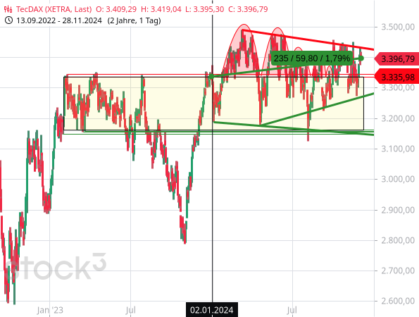 Zugleich kann man aber eine Tendenz von höheren Tiefs feststellen (grüne Linie). Und dadurch engt sich die Handelsspanne in eine Art symmetrisches Dreieck ein. Durch die vorherige Aufwärtstendenz seit dem Korrekturtief vom Oktober 2022 kann man das zwar insgesamt leicht bullish werten und einen Ausbruch nach oben erwarten, wenn aber das Tief vom 19. November bei 3.272,80 Punkten unterschritten wird, sieht es bereits nach einem Ausbruch nach unten aus. Und bis dahin sind es nur -3,65 %. Dafür reichen schon zwei schwache Tage.