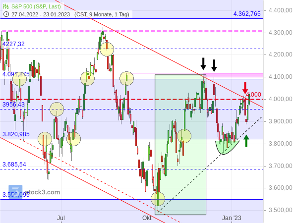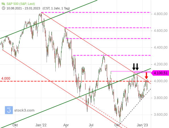 Der S&P 500 bewegt sich übergeordnet seit Anfang 2022 in einem Abwärtstrend. An dessen Oberkante ist er in der Vorwoche zum vierten Mal gescheitert. Damit misslang auch die Rückkehr über die runde 4.000-Punkte-Marke (siehe roter Pfeil).