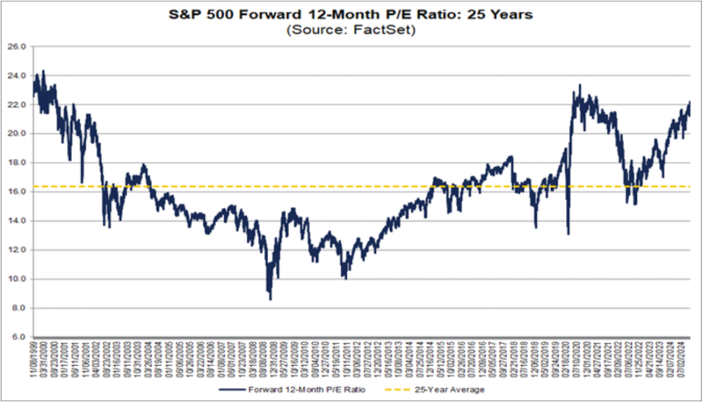 Und selbst wenn es bei einem Gewinnwachstum von +14,8 % bleibt, so ist das im Vergleich zur aktuellen Bewertung des S&P 500 eigentlich zu wenig. Denn der US-Aktienindex kommt bei einem aktuellen Stand von rund 6.000 Punkten und einer 12-Monats-EPS-Schätzung von 269,44 Dollar auf ein 12-Monats-Kurs-Gewinn-Verhältnis (Forward-P/E) von 22,2 (!). Das liegt über dem 5-Jahres-Durchschnitt (19,6) und dem 10-Jahres-Durchschnitt (18,1). Und es liegt deutlich über den historischen Werten von 16,4 im 15-jährigen und von 15,8 im 20-jährigen Durchschnitt.