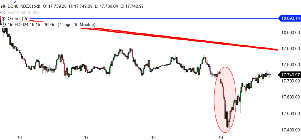 Denn der DAX war bis auf rund 17.400 Zähler abgesackt (siehe rote Ellipse im folgenden Chart), was gegenüber dem Xetra-Schlusskurs des Vortages (17.837,40) einem Minus von mehr als 400 Punkten bzw. 2,45 % entsprach.