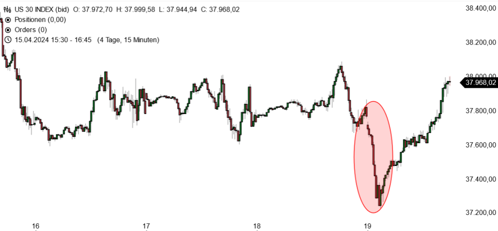 Um ca. 4:15 Uhr war der Spuk allerdings schon wieder vorbei und die Kurse gingen in eine deutliche Kurserholung. Zu diesem Zeitpunkt reagierten die Anleger wahrscheinlich erleichtert darauf, dass es nur bei einzelnen Explosionen blieb und sich somit kein Großangriff Israels als Reaktion auf den massiven Beschuss des Irans mit hunderten Raketen und Drohnen vom vergangenen Wochenende abzeichnete.