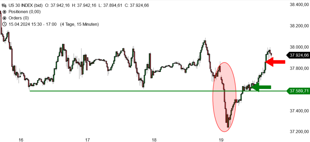 Tatsächlich boten der Kurseinbruch und die anschließende Kurserholung aber Tradingchancen. Denn durch die schnelle Rückkehr über das Korrekturtief des Dow Jones vom Dienstag bei 37.59,71 Punkten (grüne Linie im folgenden Chart) wurde der nächtliche Kurseinbruch zu einer Bärenfalle. Und häufig ziehen solche Fehlsignale eine starke Bewegung in die entgegengesetzte Richtung nach sich – so auch dieses Mal.
