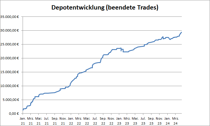 Seit Ende Februar summieren sich die realisierten Gewinne dadurch auf 1.873,94 € – beim Mindestkapitaleinsatz von 1 Kontrakt je Trade. Und dadurch stürmt die Performance aller bislang abgeschlossenen Trades weiter nach oben.