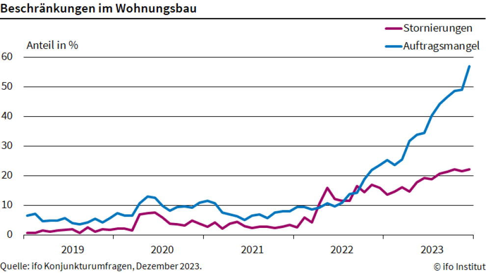 Schlechte Stimmung und düstere Prognosen kennt man auch bereits vom Wohnungsbau, der wohl auch 2024 das Sorgenkind der deutschen Wirtschaft bleibt. Der Indikator für das Geschäftsklima in dieser Branche sank im Dezember auf den tiefsten Stand seit Beginn der Erhebung 1991, wie das Ifo-Institut gestern mitteilte. Das Stimmungsbarometer fiel auf -56,8 Punkte, nach -54,4 im Vormonat. Die Wohnungsbauunternehmen befürchten für das 1. Halbjahr 2024 aufgrund eines zunehmenden Auftragsmangels und vermehrten Stornierungen weitere Geschäftseinbußen.