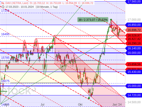 Seit dem Kursanstieg um 16,22 % seit Ende Oktober, bei dem am 14. Dezember das aktuelle Rekordhoch bei 17.003,28 Punkten markiert wurde, befindet sich der deutsche Leitindex in einer Konsolidierung. Dabei hat sich zwar ein Abwärtstrend(kanal) ausgebildet (rot), dieser verläuft aber relativ flach. Die Wellen überschneiden sich und die Kurse pendeln um eine Konsolidierungslinie (rot gestrichelt). Der DAX legt also eine klassische Pause im Aufwärtstrend hin, was gewöhnlich darauf hindeutet, dass am Ende dieser Pause die Aufwärtsbewegung fortgesetzt wird. Die Bullen holen quasi nur Luft für den weiteren Anstieg.