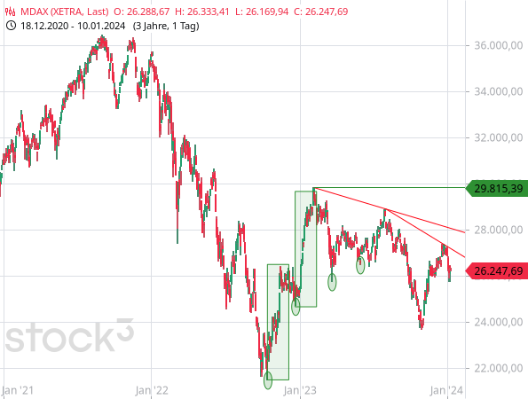 Während die Aktienindizes der USA aktuell noch in der Nähe ihrer Schlusskurse des Vorjahres notieren, ebenso wie unser heimischer DAX, sieht es bei MDAX, SDAX und TecDAX etwas anders aus. Diese drei Aktienindizes liegen derzeit jeweils mehr als 2 % im Minus. Der MDAX (siehe folgender Chart) ist mit einem Minus von fast 3 % davon zur Zeit der Schwächste.