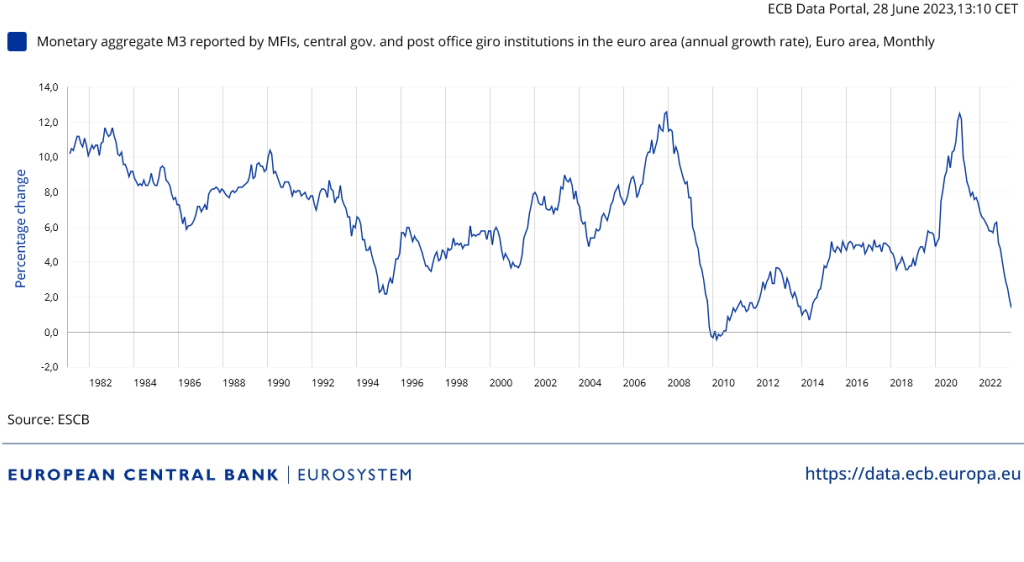 Dementsprechend lässt auch das Wachstum der Geldmenge nach (M3, siehe folgende Grafik).