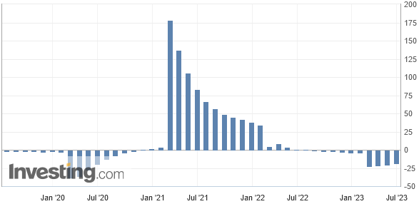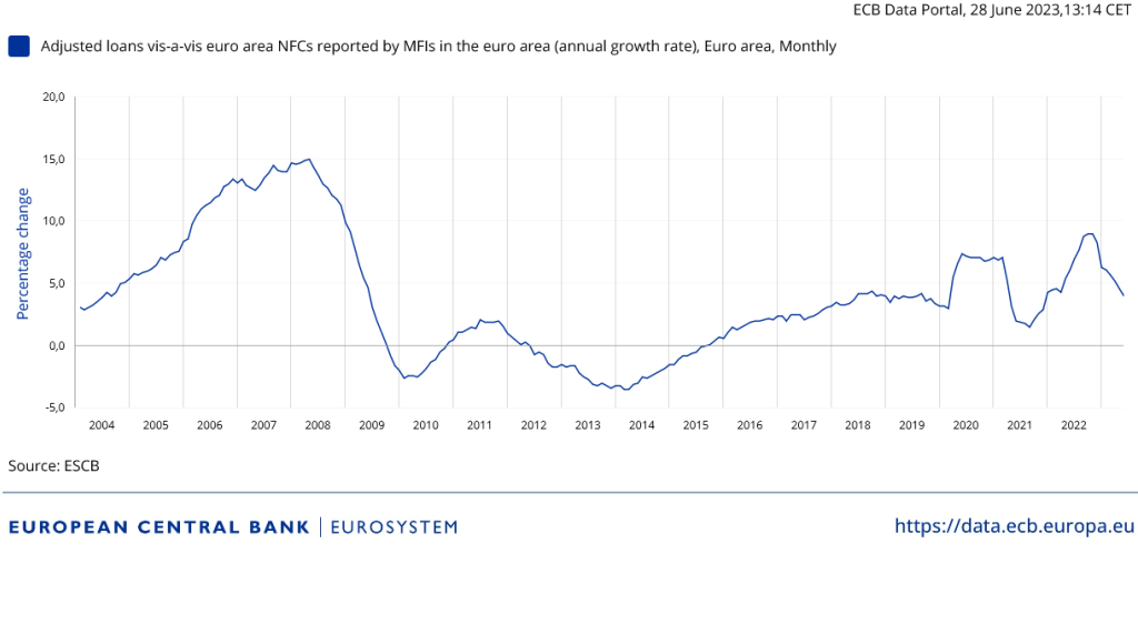 Interessanter ist da schon, dass die Kreditvergabe von Banken an Firmen und Privathaushalte im Euroraum infolge des rasanten Straffungskurses der Europäischen Zentralbank (EZB) immer mehr an Dynamik verliert. Unternehmen erhielten im Mai noch 4,0 % mehr Darlehen als im Vorjahr, nach +4,6 % im April und +5,2 % im März.