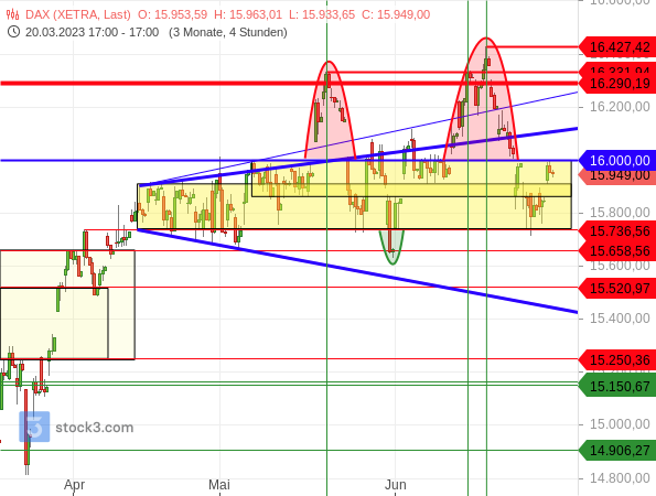 Ist das nur eine Gegenbewegung nach den vorherigen Kursverlusten an 6 Handelstagen in Folge oder bleibt es auch hier wieder nur bei einem kleinen Rücksetzer? Eine Rückeroberung der 16.000er Marke würde für das Ende der Korrektur bzw. die Fortsetzung der Seitwärtstendenz sprechen, ein deutliches Abprallen mit neuem Korrekturtief könnte das Ende des Aufwärtsdrangs der Bullen und eine Übernahme des Marktes durch die Bären bedeuten. Dann gelten wieder die vorgestern genannten Marken.