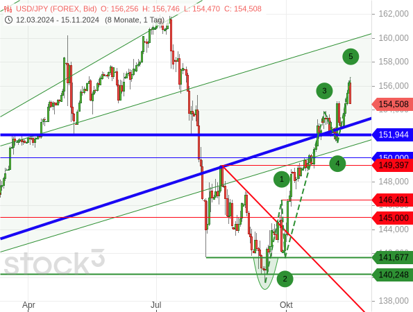 Und es ist auch nicht verwunderlich, dass der japanische Yen ebenfalls unter dem starken Dollar leidet. Denn auch die japanische Wirtschaft kann mit den USA nicht mithalten. Kürzlich mussten daher schon wieder fast 157 Yen für einen US-Dollar auf den Tisch gelegt werden.