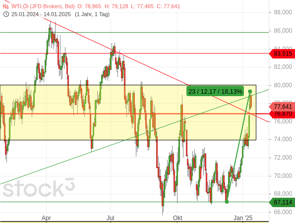 Ein Belastungsfaktor für die Börsen waren jüngst auch stark steigende Ölpreise. Notierte die US-Sorte West Texas Intermediate am 6. Dezember noch bei 67,3 USD (siehe „Das gilt es beim Trading auf den Ölpreis zu achten“), so sind es etwas mehr als einen Monat später nun 78,6 USD bzw. fast 17 % mehr. Vom Tief bis zum Hoch sind es sogar +18,13 %).