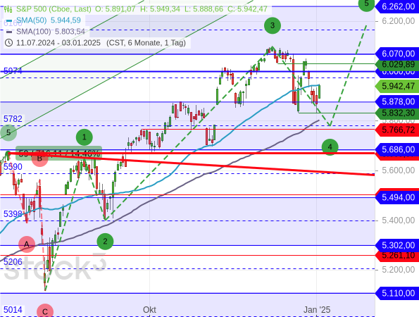 Demnach sollte der Index also im Rahmen einer Welle 4 noch bis zur Rechteck-Mittellinie bei 5.782 Punkten fallen und dann im Rahmen einer Welle 5 wieder zulegen. Aktuell sieht der Chart wie folgt aus: