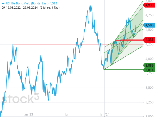 Wobei mit 4,33 % ein höheres Tief markiert wurde. Und mit der aktuellen dynamischen Erholung von diesem Tief in Richtung der vorherigen Hochs lässt sich eine deutliche Beschleunigung des Renditeanstiegs ausmachen (grüne Trendkanäle).