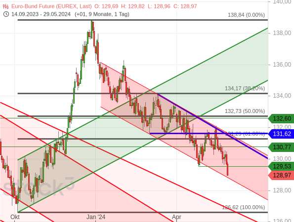 Noch drastischer trifft dies den Anleihemarkt hierzulande. Grundsätzlich führen steigende Renditen zu einem Rückgang der Anleihekurse. Und der Bund-Future wurde durch die derzeit wieder steigenden Renditen gestern sogar auf ein neues Tief in seinem monatelangen Abwärtstrend gedrückt.