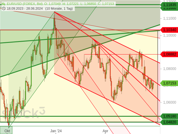 Und auch der EUR/USD hat sich kaum bewegt. Bei meiner letzten Analyse vom 14. Juni notierte er nach einem deutlichen Kursrückgang bei 1,0678 USD (siehe „Wie kurz sind dieses Mal die Beine der politischen Börsen?“). Seitdem hat der Wechselkurs auf diesem Niveau konsolidiert.