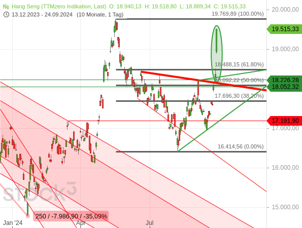 Dennoch reagierten die Börsen sehr positiv auf die gestrige Meldung, da die Maßnahmen die Erwartungen der Marktteilnehmer übertroffen haben. Der chinesische Aktienindex Hang Seng zog zum Beispiel um mehr als 6 % an (siehe grüne Ellipse im folgenden Chart).