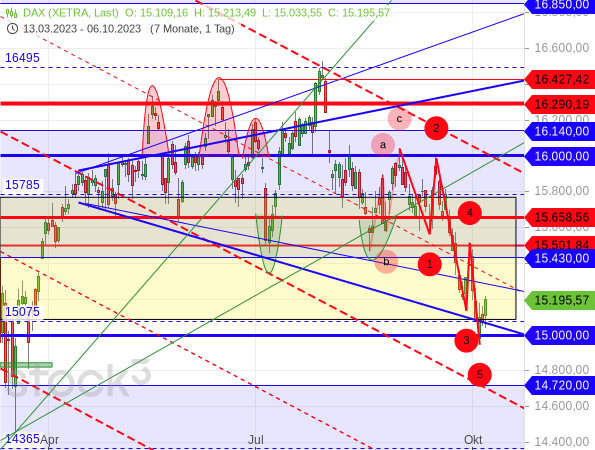 Zudem hat der DAX zwar die untere Linie einer möglichen Trompetenformation (blau) sowie die Mittellinie bei 15.075 Punkten gebrochen, womit er auch aus seiner Seitwärtsrange herausgefallen ist (gelb), er konnte aber beide Linien sowie die Handelsspanne sehr schnell zurückerobern. Womöglich ist die ABC-Erholung also bereits angelaufen. Und diese hat aus Sicht der Target-Trend-Methode als erstes Kursziel die Rechteckgrenze bei 15.430 Punkten.