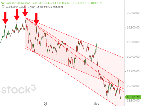 Auch beim Nasdaq 100 erkennt man eine deutliche Veränderung im Kursverlauf – von einer Aufwärts- zu einer Abwärtstendenz. Ich erinnere an folgenden Chart aus der Börse-Intern vom 23. August.