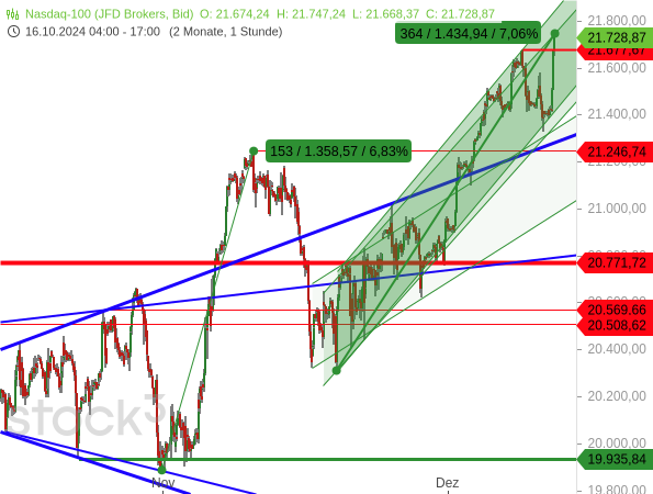 Der Nasdaq 100 konnte dadurch seinen kurzfristigen Aufwärtstrend fortsetzen (grün im folgenden Chart). Interessant ist dabei: Der Index hatte zuvor von der oberen Trendkanallinie zur unteren zurückgesetzt – passend zur Chartanalyse vom 4. Dezember (siehe „Dow Jones und Nasdaq 100 an oberen Trendkanallinien“).