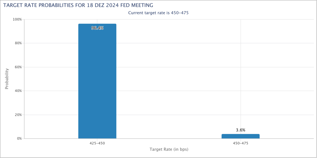Das sehen auch die Anleger an den Terminmärkten so. Laut dem FedWatch-Tool der CME Group stieg die Wahrscheinlichkeit, dass die Fed ihren Leitzins erneut um 25 Basispunkte senken wird, nach den Inflationsdaten auf 95 %, nachdem es am vergangenen Freitag 85 % waren (siehe „Das gilt es beim Trading auf den Ölpreis zu achten“).