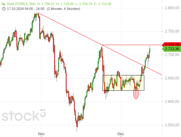 Diese Entwicklung kommt offensichtlich dem Goldpreis entgegen. Denn er konnte aus einer kurzfristigen Seitwärtskonsolidierung (gelbes Rechteck im folgenden Chart) nach oben ausbrechen und eine Abwärtslinie (rot) überwinden.